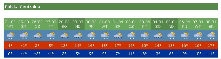 Jeszcze mniej miłym dniem będzie środa, gdy na większą część kraju spadnie deszcz. I wcale nie ciepły wiosenny kapuśniak, gdyż średnia temperatura wyniesie około 12 stopni. Najzimniej będzie w Gdańsku, Warszawie i Lublinie - jedynie 10 stopni. Pogoda zacznie się poprawiać w czwartek, gdy mimo zachmurzenia nie powinno padać. Naprawdę cieplej będzie dopiero w piątek. Niemal wszędzie słupki rtęci pokażą ponad 20 stopni.