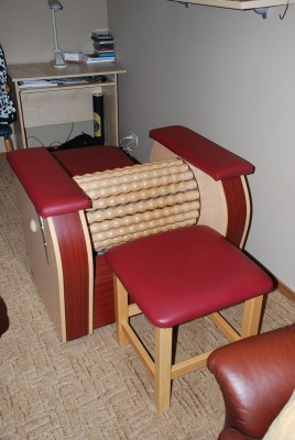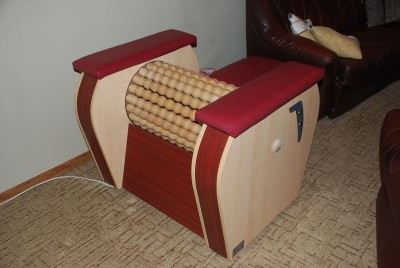 4. Usiąść na stołku drewnianym, dołączonym do urządzenia i masować kolejno partie ciała według programu masażu.