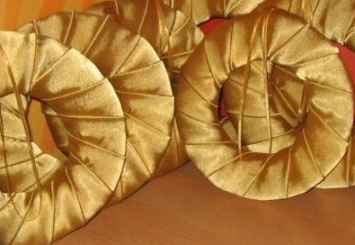 -sześć pojedynczych obrączek z tasiemką do zawieszenia o śr.20,21,23cm.Owinięte złotą satyną.