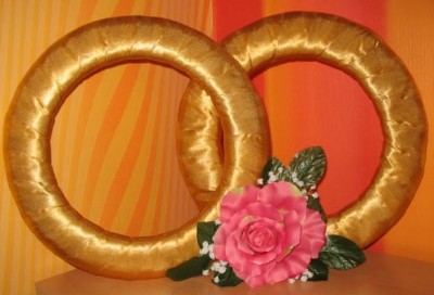 -dwie duże obrączki(owinięte złotą wstążką) połączone różą w kolorze różowym,szer-52cm,wys-33cm.