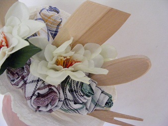Polecam bukiet z ręczników kuchennych i łopatek drewnianych na 1 z łopatek może zostać wypalona krótka dedykacja lub imiona osoby obdarowywanej, data.