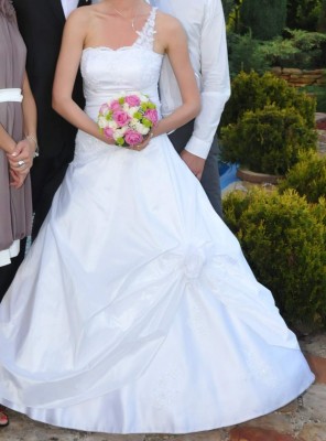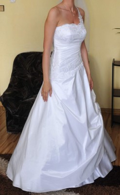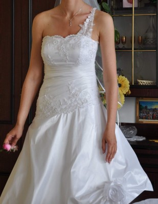 Przedmiotem ogłoszenia jest suknia ślubna, szyta na miarę, gorset stanowi przedłużenie sukni, jest rozpoczęty koronką w środku uzupełniony draperiami, a zakończony również koronką, także całość jest idealnie przemyślana. Połączenie owego gorsetu z suknią jest wyróżniona ukosem, co nadaje dodatkowy element „inności” tej sukni.