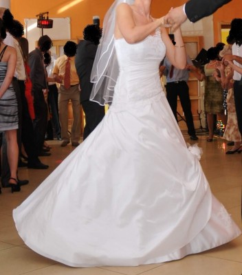 , biała osadzona na trzech lub dwóch kołach w zależności od gustu ( dzięki temu, że koła nie są wszyte tylko można je wyciągać, ja osobiście miałam na jednym). Przy siadaniu suknia nie unosi się do góry, jest lekka i swobodna w tańcu, chodzeniu i siedzeniu. Atutem jest to, że nie miałam wrażenia, iż jest na kołach, czego obawiałam się na samym początku. Po jej założeniu byłam bardzo zadowolona.